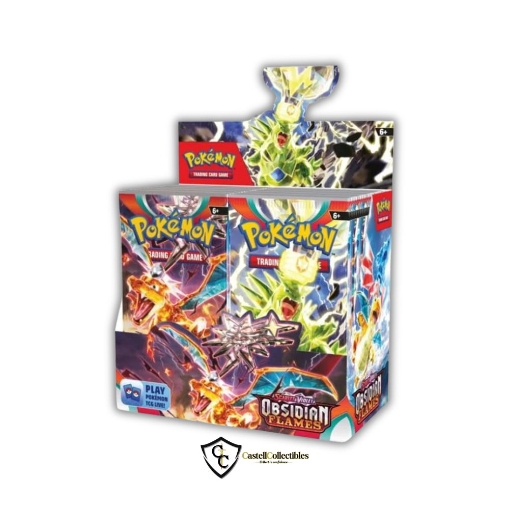 The heat is on in the Pokémon Obsidian Flames Booster Box, where Tera Charizard ex takes center stage with a new Dark Tera Type twist. This Scarlet & Violet expansion brings dazzling foil cards, type-shifted Tera Pokémon, and fan-favorite characters into the spotlight.